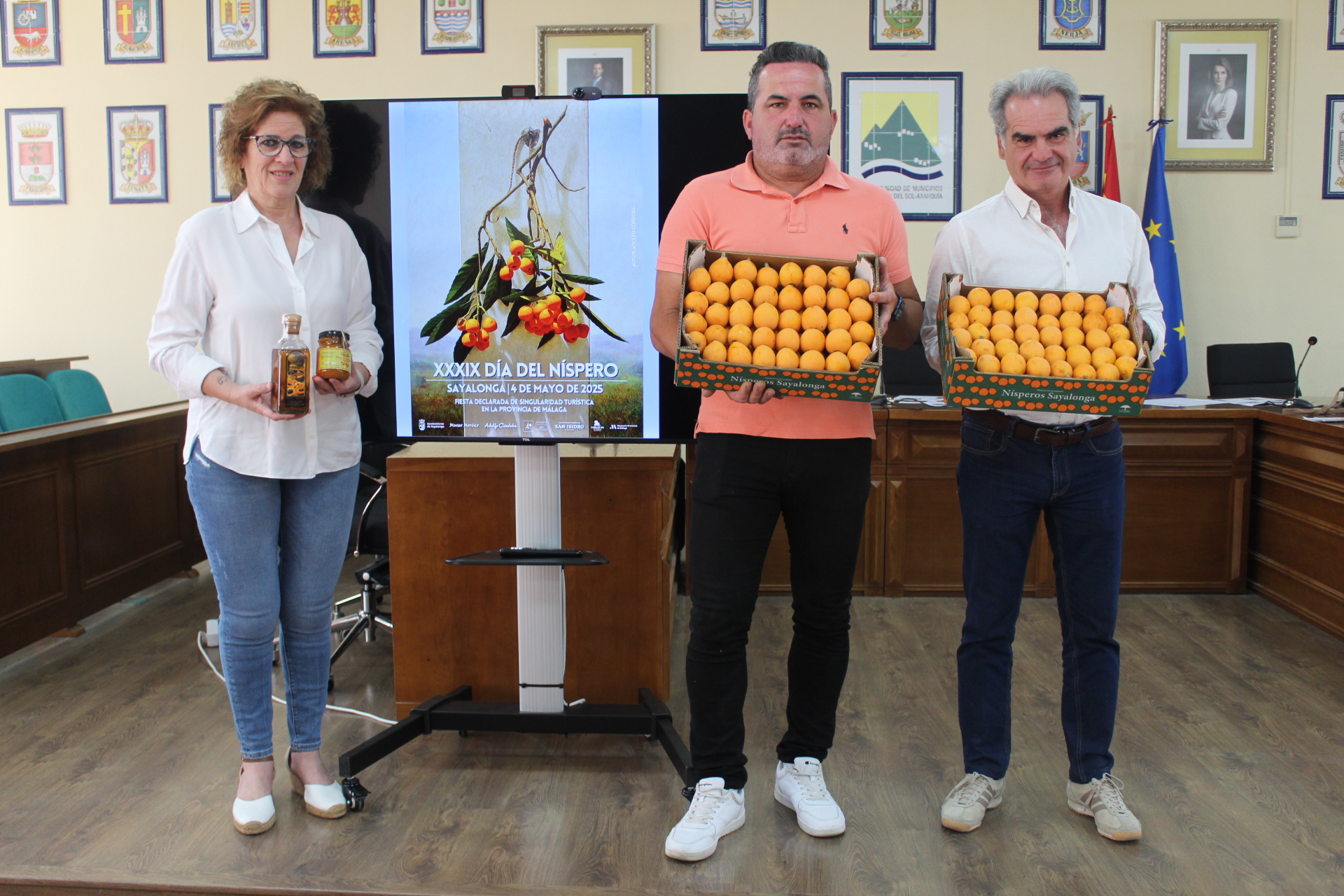 El vicepresidente responsable del área de Agricultura de la Mancomunidad de Municipios de la Costa del Sol, Francisco Ruiz; la alcaldesa de Sayalonga, Sagrario Fernández y el concejal Alexis Sánchez han presentado esta mañana el programa de actividades que tendrá lugar el próximo domingo 4 de mayo con motivo de la XXXIX edición del Día del Níspero.